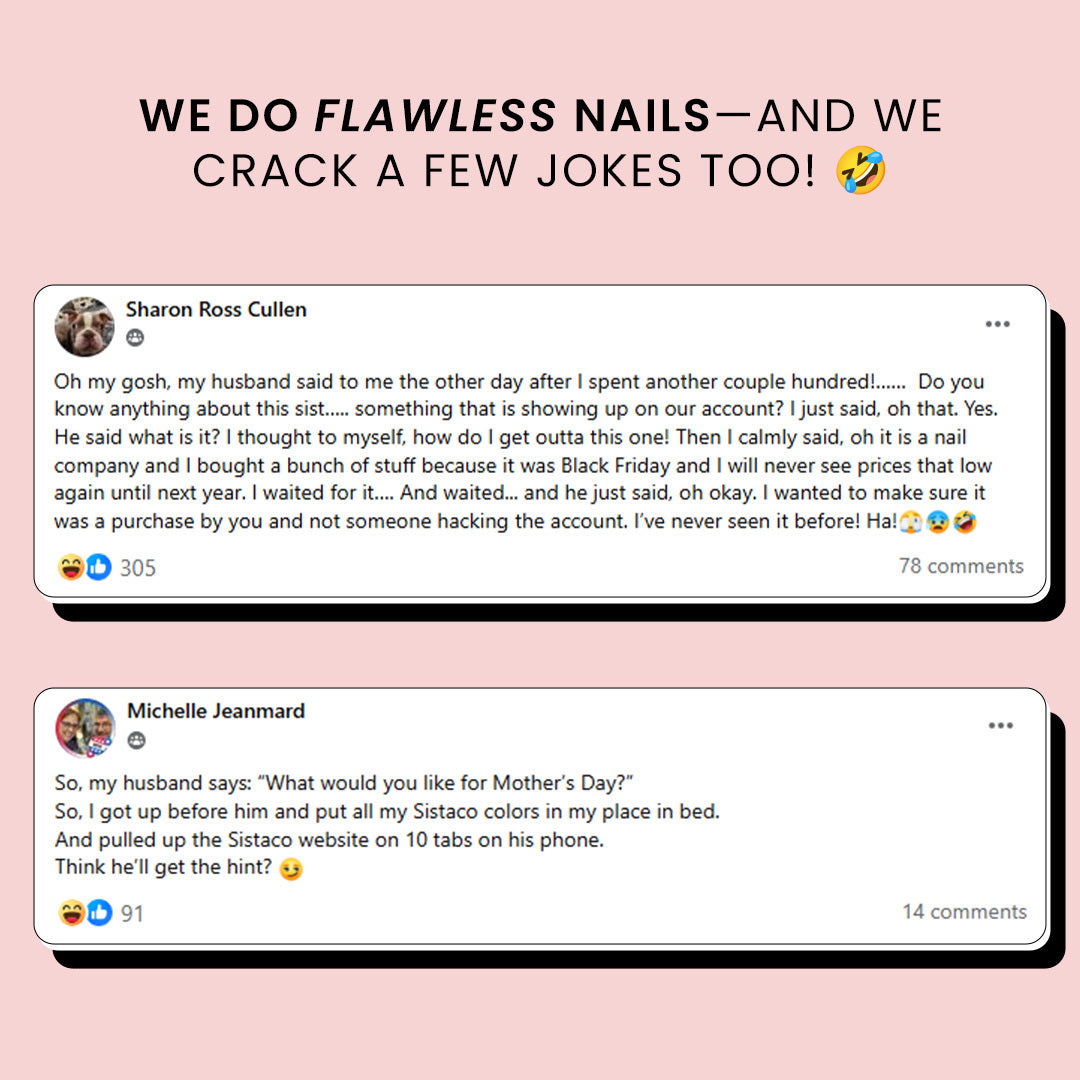 I ordered sistaco as I was tired of spending so much time and money getting my nails done. I tried painting them myself,but I am terrible at it . I saw this product and after alot of research and frankly skepticism ..I figured why not? I just finished doing my nails for the second time using the product. I give myself a pass the first time. While my first attempt wasn't bad...I still had some learning to do. However , my second attempt was much better. I am soo impressed and happy with your product and how my nails turned out. It's easy to use. The finished result looks just as good as the salon finish. I am so glad I gave it a try. You have a lifetime customer.